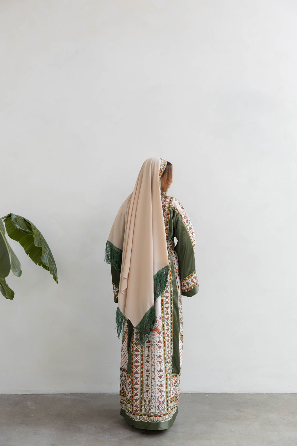 Cross-stitch embroidered thobe with satin panels. Comes with a matching two-sided belt, one side embroidered and the other satin. Includes a matching veil with embroidered and fringed details.