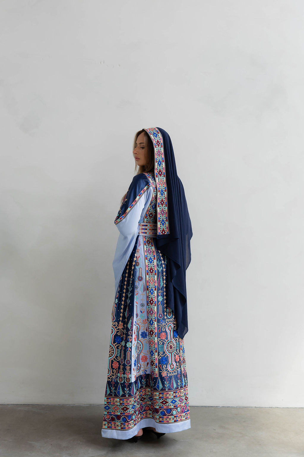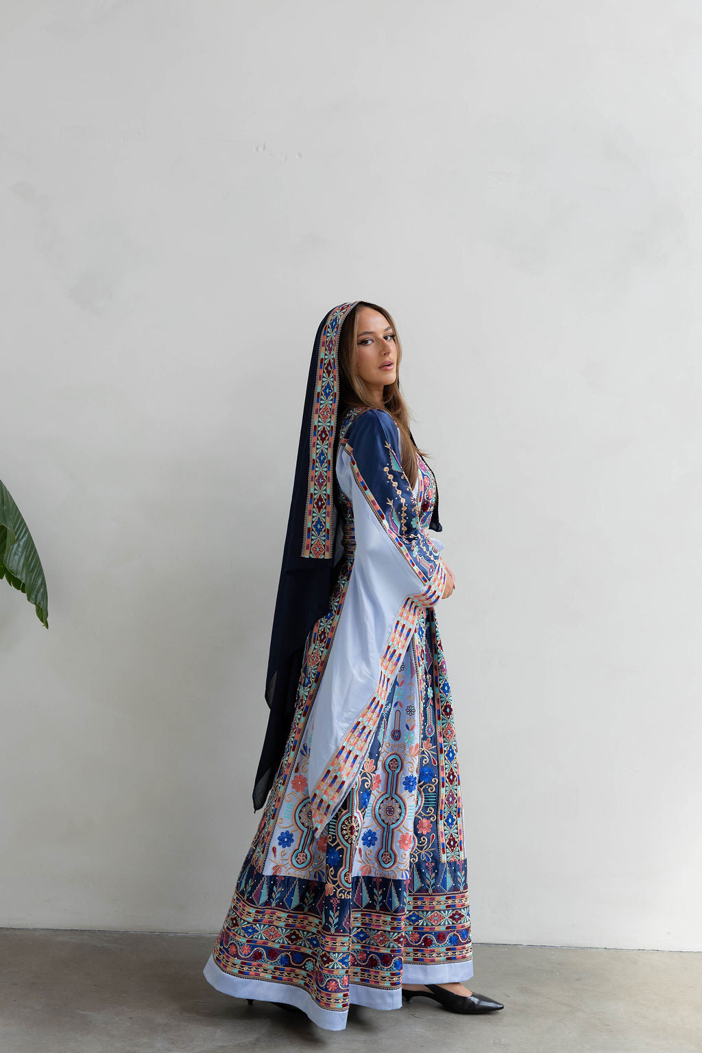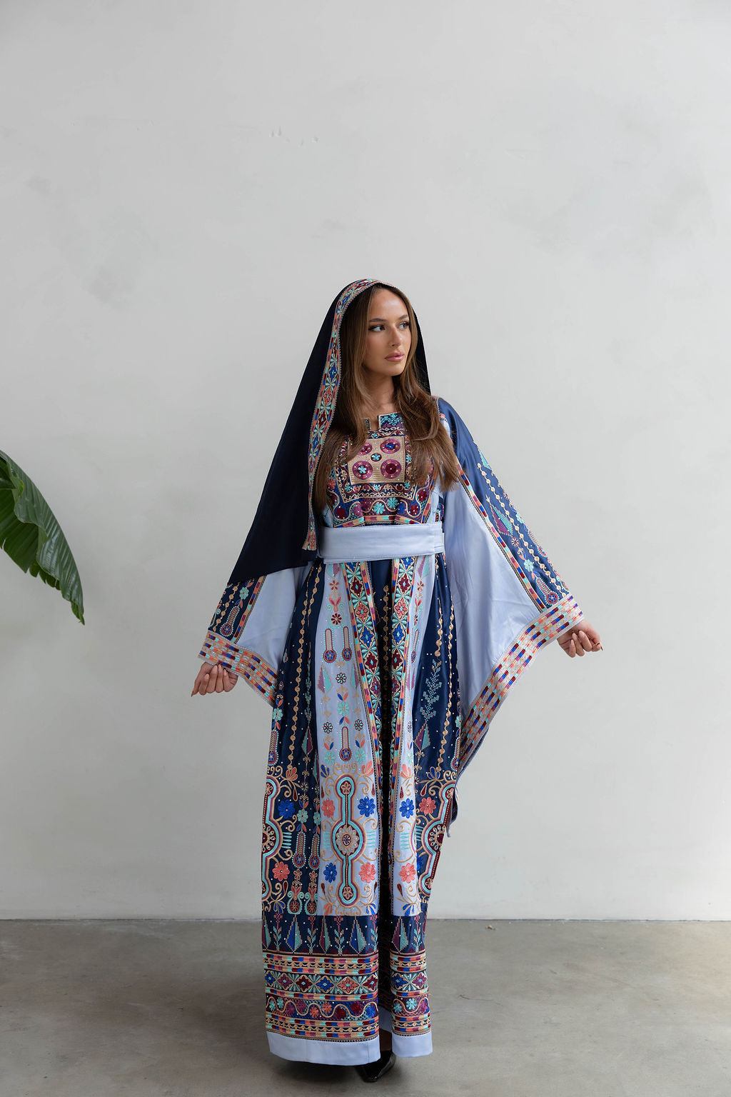 Full satin thobe with elegant (extra) long sleeves (the sleeves open only at the wrist). Comes with a matching veil and a two-sided belt: one side satin, the other embroidered.