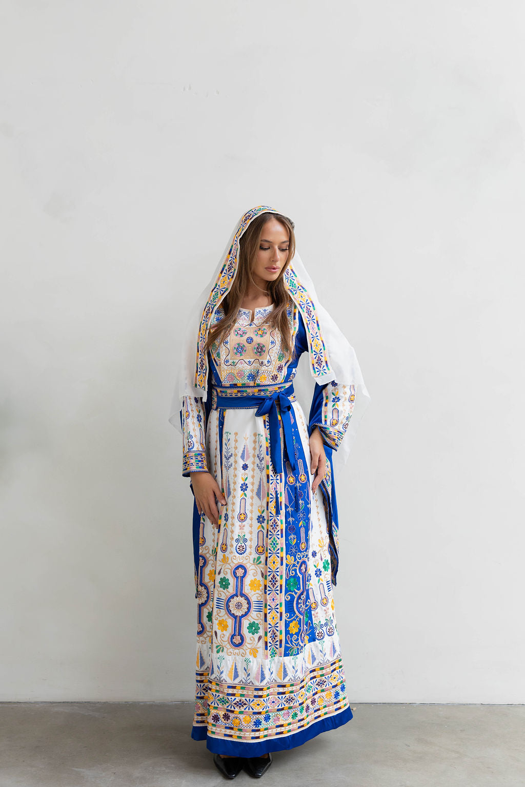 Full satin thobe with elegant (extra) long sleeves (the sleeves open only at the wrist). Comes with a matching veil and a two-sided belt: one side satin, the other embroidered.