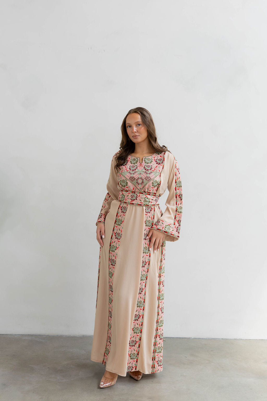Embroidery thobe with a floral pattern, complemented by a matching embroidered belt.