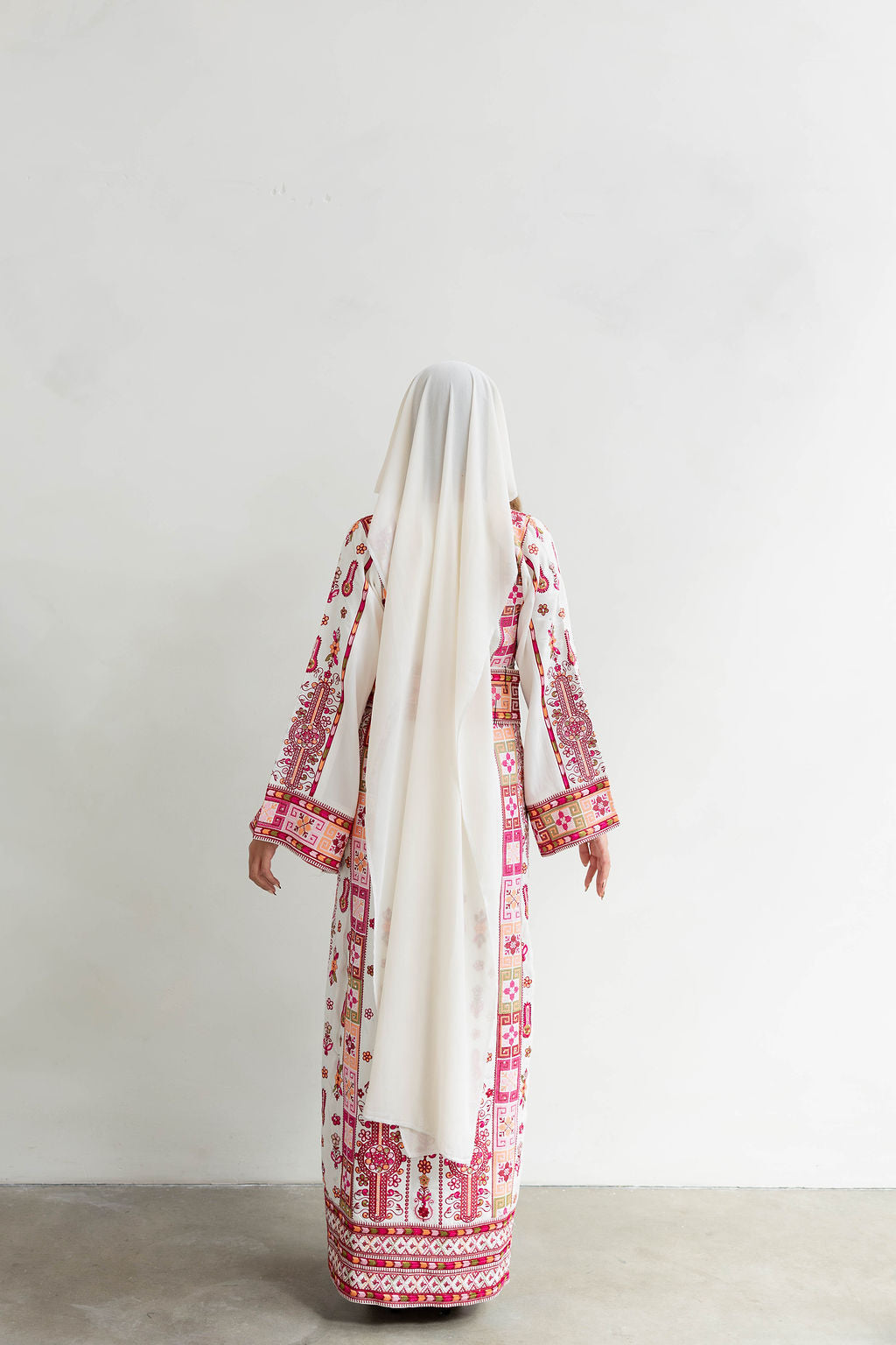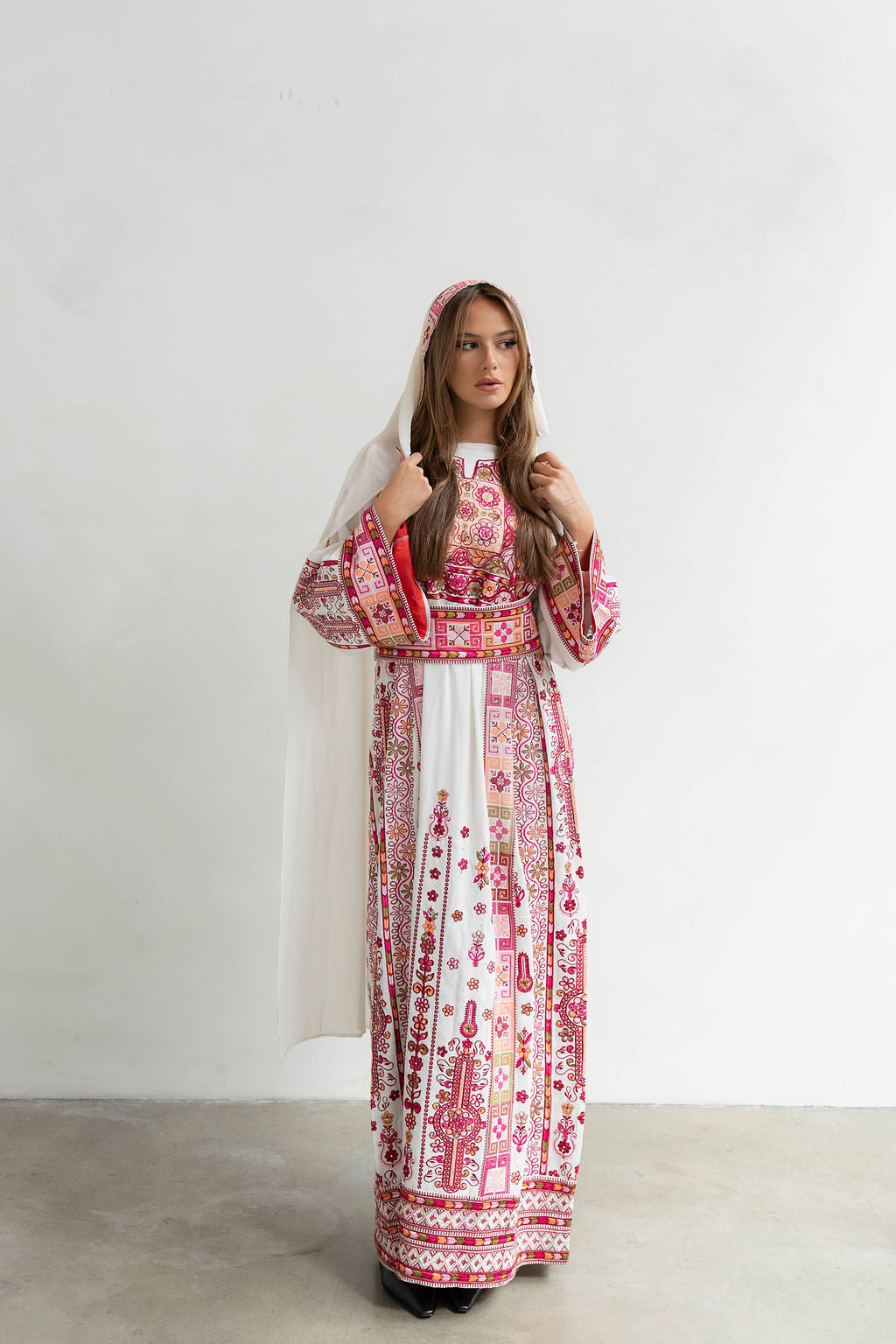 Ramallah thobe with detailed embroidery. Comes with a matching embroidered belt and veil. Tip: you can add an extra touch by pairing it with one of our satin belts, available on our website. Note, we recommend a underdress for this thobe (also available for purchase on our website).